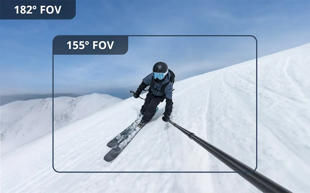 La lente FOV Boost dedicata, che allarga il campo visivo da un ampio grandangolo nativo a un’ottica ultra-grandangolare davvero immersiva, ideale per sport, montagne, mare.