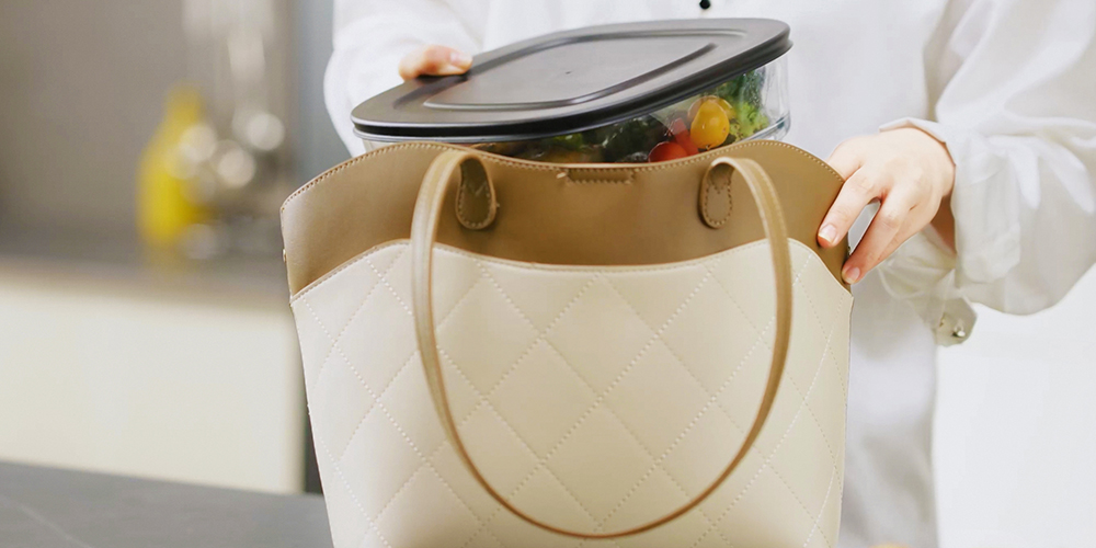 Al termine della cottura è sufficiente applicare il coperchio sigillante e il contenitore si trasforma in un lunch box. Una soluzione intelligente che riduce i passaggi, evita di sporcare altri piatti e rende il meal prep molto più immediato.