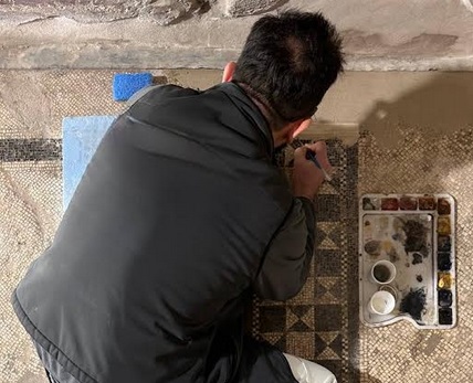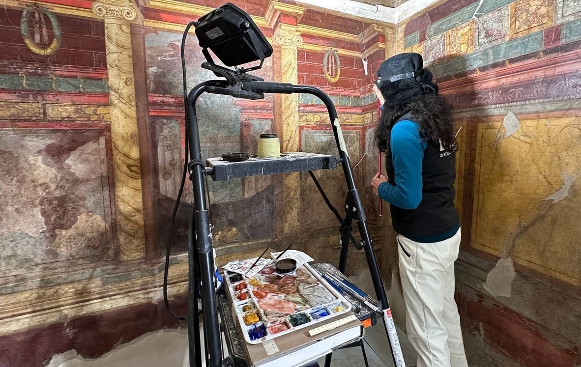 Al centro dell’attenzione c’è il Salone della Maschera e del Pavone, uno degli ambienti più raffinati della villa, decorato in II stile. Accanto alle maschere già note, sono emersi nuovi frammenti, tra cui una maschera scenica identificabile con Pappus, personaggio della Commedia Atellana, e una pavonessa integra che completa il pavone maschio già conosciuto, arricchendo il programma decorativo. Frammenti con un tripode dorato inscritto in un oculus dialogano con un tripode in bronzo dipinto su un’altra parete, restituendo la complessità dei riferimenti simbolici interni. Lo scavo restituisce inoltre il giardino della villa con precisione rara: le impronte degli alberi, conservate nel punto originale, rivelano uno schema ornamentale che raddoppia il colonnato del porticato meridionale, in continuità con modelli già noti nelle domus del sito pompeiano e all’interno della stessa Oplontis. Alla mappa della villa si aggiungono quattro nuovi ambienti, tra cui un vano absidato probabilmente legato al settore termale, che approfondisce la conoscenza dell’organizzazione funzionale della residenza. Le indagini hanno permesso anche di riconoscere un paleoalveo post-eruzione del 1631, utile a ricostruire l’evoluzione del paesaggio e i rapporti tra area archeologica e dinamiche naturali. Parallelamente, prosegue il restauro di due cubicola nel settore sud-occidentale: stucchi, affreschi e mosaici pavimentali recuperano leggibilità dopo degrado e interventi precedenti. Cromie, motivi architettonici illusionistici, paesaggi e fondi monocromi riemergono, insieme a calchi di porte e finestre che conservano tracce del legno originale, con pigmenti preziosi come il blu egizio. Il cantiere guarda anche oltre il perimetro della villa: l’ampliamento è pensato per creare collegamenti con lo Spolettificio Borbonico, dove saranno realizzati spazi espositivi, depositi e servizi aggiuntivi, rafforzando la rete tra archeologia e città.