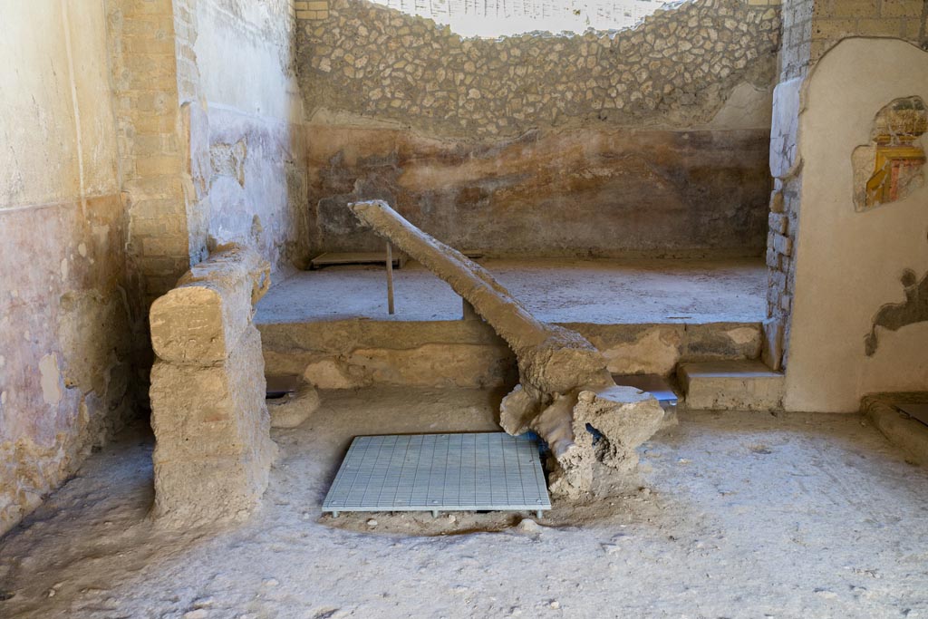 Accanto alla cantina si trova l’area destinata alla spremitura dell’uva. Sebbene la struttura lignea originale non sia conservata, le basi in pietra e le tracce archeologiche consentono di ricostruire il funzionamento del torchio vinario.