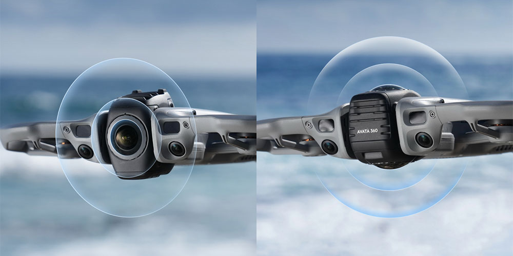 La vera peculiarità di Avata 360 non sta però nella forma ma nella sua doppia identità. Da un lato è un drone 360 completo, con due sensori e due lenti che catturano tutto ciò che lo circonda. Dall’altro può trasformarsi in un drone con obiettivo singolo, più tradizionale, ideale per riprese lineari in stile FPV o per video aerei classici.