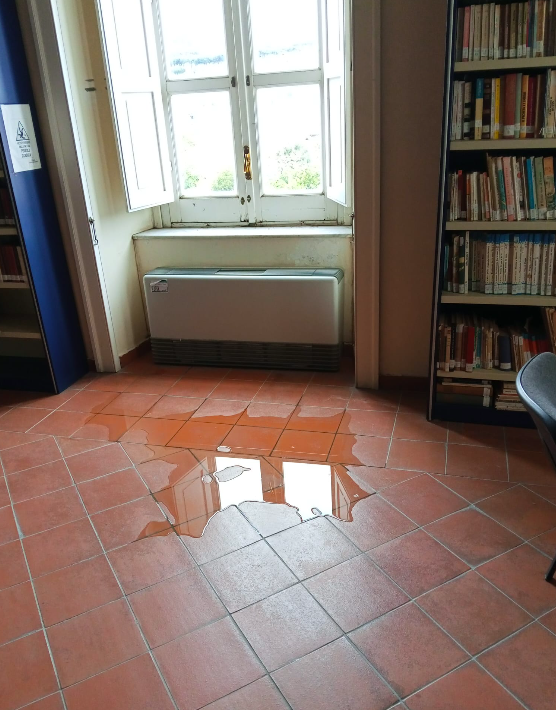 Alcune sale, infatti, si sono presentate allagate con infiltrazioni d’acqua che hanno raggiunto scaffalature e volumi, mettendo a rischio un patrimonio già fragile. Secondo il docente, il problema non è episodico bensì strutturale: gli infissi – evidentemente inadeguati – non avrebbero retto alle piogge, aggravando una condizione di precarietà già evidente.