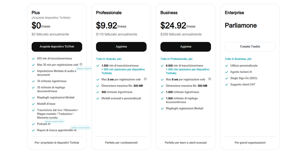 I 600 minuti mensili inclusi risultano sufficienti per un utente occasionale, ma possono diventare limitanti per chi registra con regolarità lezioni, conferenze o intere giornate di interviste.